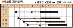 | まき時期 | 春まきは加温して発芽育苗する。発芽~育苗がちょっと難しいので中級。栽培自体は容易。 |